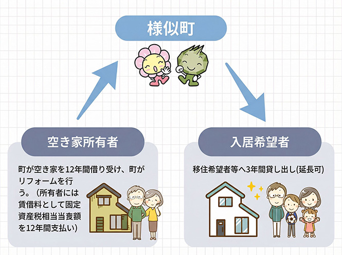 サブリース(中間管理)住宅とは、町内にある空き家を町が12年間借受け、町が必要なリフォームを行い、原則3年間、移住希望者等に貸し出しを行う公共の賃貸住宅です。