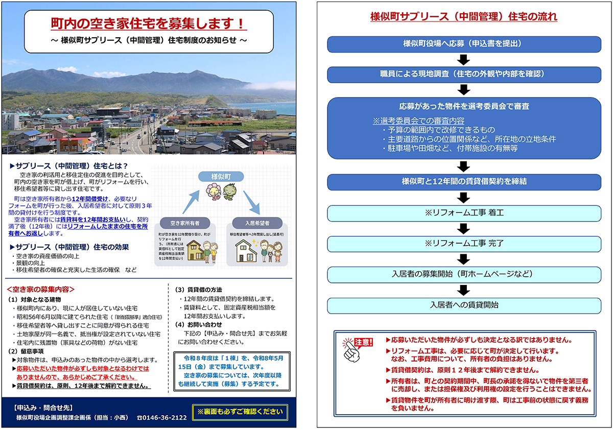 様似町では、空き家の利活用と移住定住の促進を目的として、サブリース住宅として使用する空き家と、入居を希望する移住者等を募集します。
