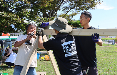 - 職員研修に合わせて、園庭で使用するテーブルやベンチ、遊具収納棚をDIY作業で作成しました。作成にあたり、様似建成会の皆様に電動工具の使い方や作業の留意点を教えていただいたことで、職員も安全に楽しく作業を進めることができました。