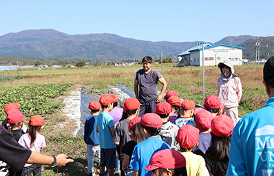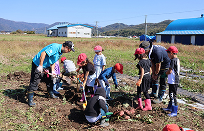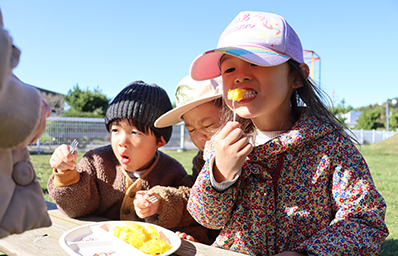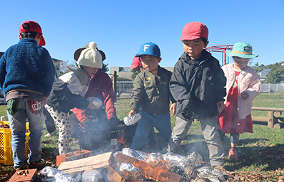 - 今年10月、町内農家さんのご厚意で芋ほり体験させていただき、収穫したサツマイモで焼き芋をしました。園庭で火をおこし始めると、5歳児クラスの子供たちが火おこしやサツマイモの下準備をすすんで手伝ってくれました。雪が降る中で食べる焼き芋の味は格別で、お腹いっぱい味わいました。