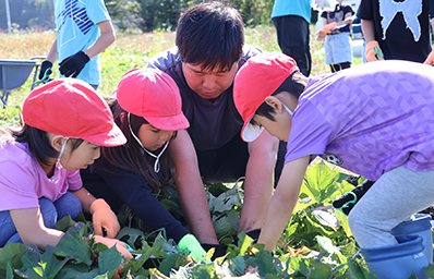 - 昨年に引き続き、野菜作りを行っている保護者のご厚意により、4・5歳児クラスの子どもたちがサツマイモ掘りを体験しました。子どもたちはサツマイモのつるをハサミで切り、一生懸命土を掘り返し立派に育ったサツマイモを収穫し、大喜びしていました。