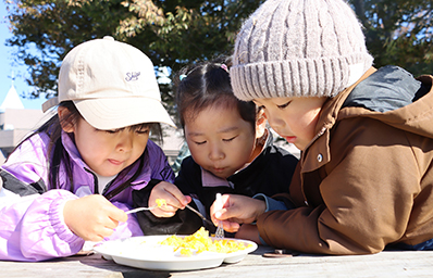 収穫したサツマイモを使い、後日園庭で焼き芋大会を開催。みんなで落ち葉を拾い集めて焚火をし、おいもが焼きあがるとその美味しさに目を細め、おなかいっぱい味わいました。