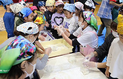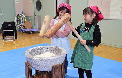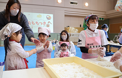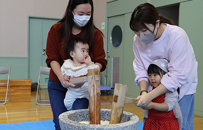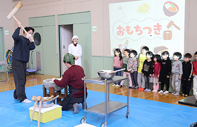 - 今年も園児たちが元気にもちつきを楽しみました。もちつき大会のために、地元生産者のご厚意でもち米をいただきました。また、保護者、5歳児クラス園児の祖父母、様似町食育委員会の皆さまにご協力いただきました。