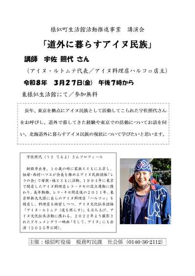 今回は、長年東京を拠点にアイヌ民族として活動してこられた宇佐照代さんをお呼びし、道外で暮らしてきた経験や東京での活動についてお話しを伺い、北海道外に暮らすアイヌ民族の現状について学びたいと思います。