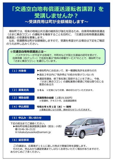 様似町では、将来の地域公共交通の維持及び強化を図るため、自家用有償旅客運送(さまに乗合ワゴン)の運転手を確保することを目的に、「交通空白地有償運送運転者講習」の受講者を募集します。